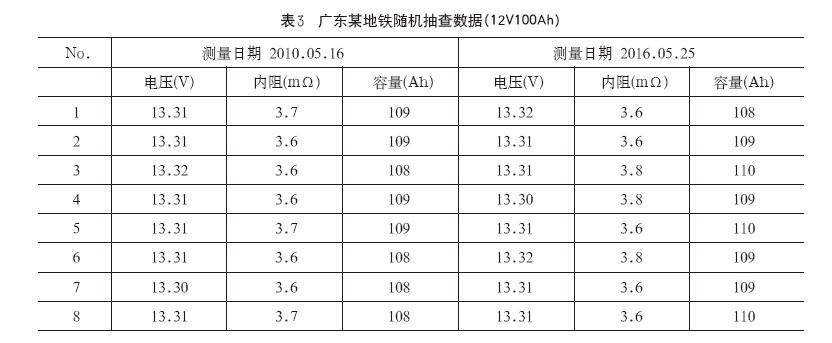 根據調查,在北美Switch數據中心、Latisys數據中心、DigitalRealityTrust數據中心、Facebook數據中心、香港機場、香港地鐵、廣州地鐵等用戶中,均有大量的純鉛薄極板電池在投入使用,經過長時間跟蹤測試發現,純鉛薄極板電池均一性好、使用溫度範圍寬、支持間歇式充電、無一例發現有電池變形、漏液等明顯的製造瑕疵,用戶普遍評價較好。表3為廣東某地鐵隨機抽查數據(12V100Ah)。